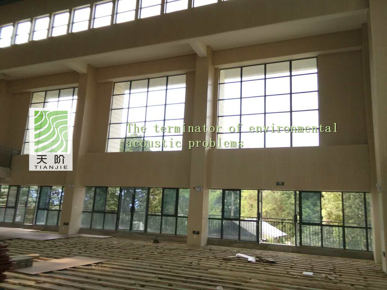 找了聲學專家對籃球館進行了聲學設(shè)計,采用了槽木吸音板。
