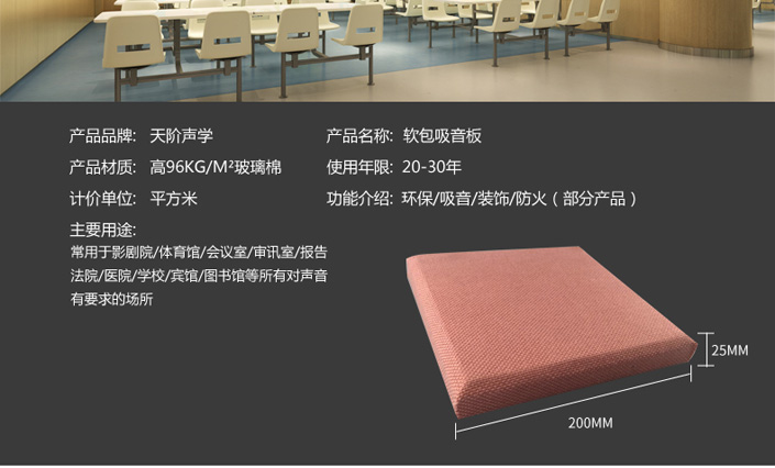天階-防撞布藝軟包吸音板又叫吸音軟包,采用阻燃樹(shù)脂邊框或木質(zhì)邊框或鋁質(zhì)邊框內(nèi)放置,防火的特物吸聲棉,外包防火吸聲布藝或環(huán)保皮,牛皮等制成。防火處理后達(dá)到***防火GB 8624 2006 C級(jí)(同GB 8624 2012-B1級(jí))要求。天階聲學(xué)生產(chǎn)的布藝吸音板,具有環(huán)保、防火、吸聲頻帶寬、裝飾性強(qiáng)、施工簡(jiǎn)單,無(wú)粉塵污染等性能,飾面顏色及材料選擇性廣。