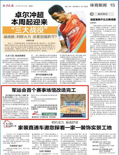 武漢軍運(yùn)會(huì)相關(guān)場館設(shè)施項(xiàng)目計(jì)劃在明年4月全面竣工。