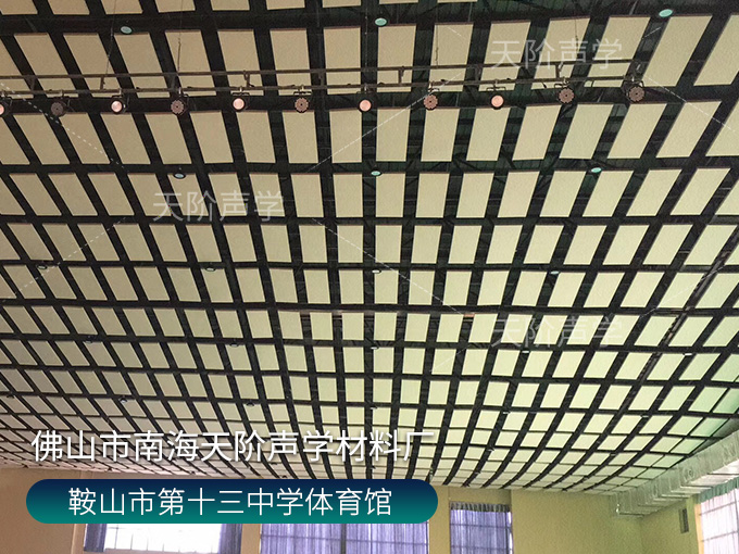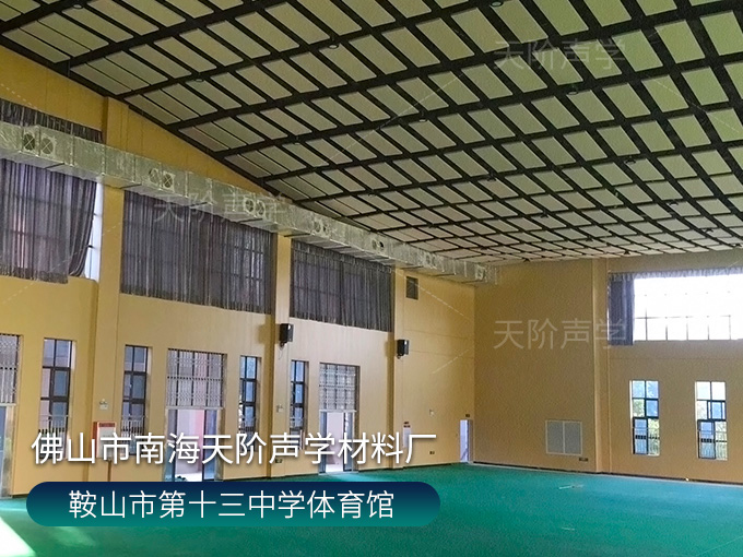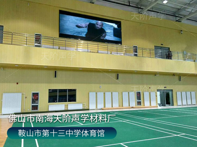 鞍山市第十三中學(xué)體育館,墻面使用槽木吸音板,基材選用不燃堅(jiān)硬的玻鎂基材,飾面選用活力青春的色調(diào)。條形開(kāi)槽吸音板,吸音效果顯著,能吸收活動(dòng)期間的噪音,回聲。