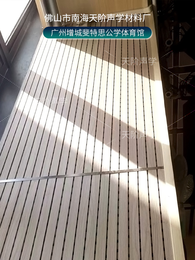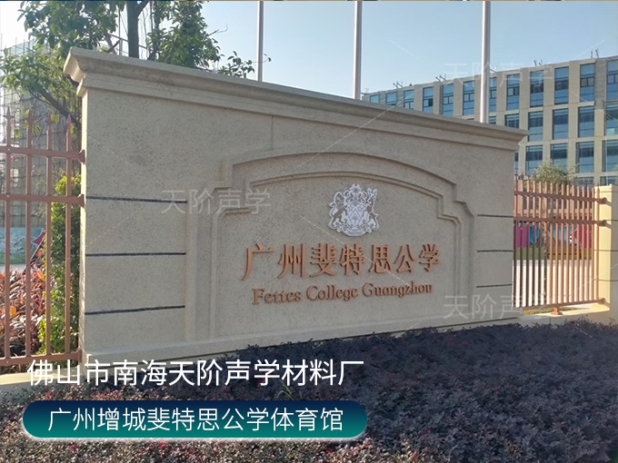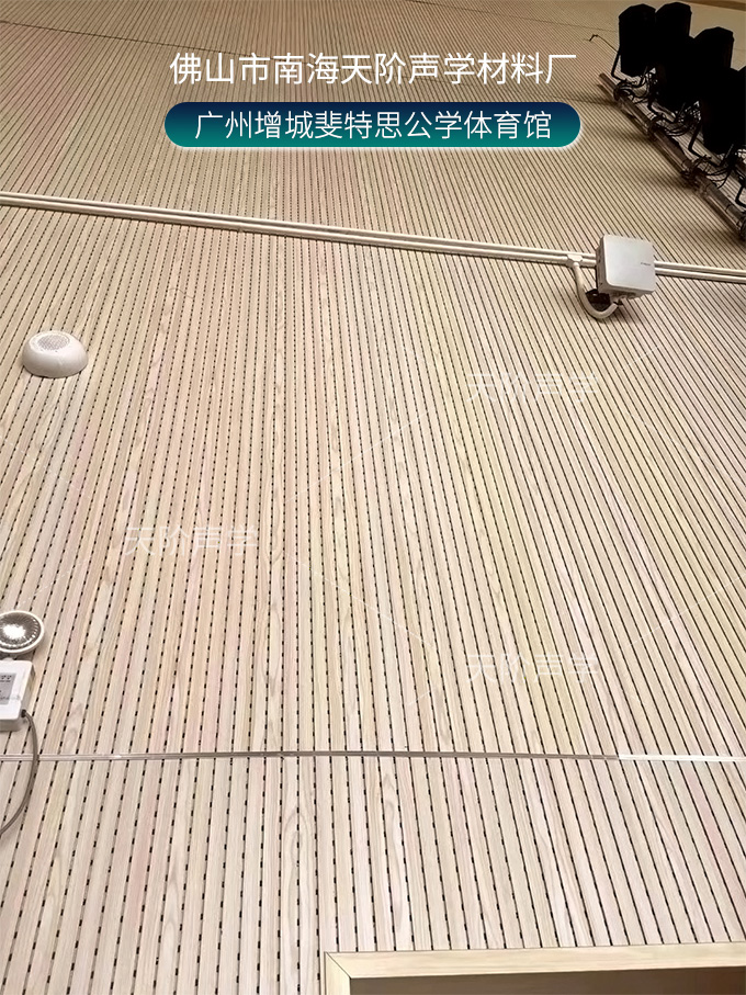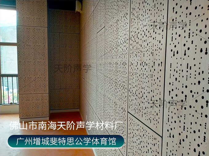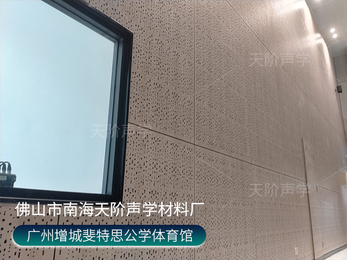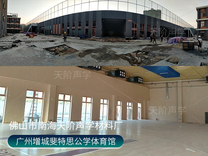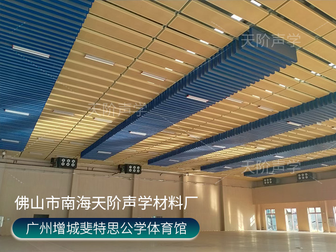 廣州增城斐特思公學項目,體育館選用天花吊頂平板空間吸聲體,色彩使用活力動感的黃色+藍色搭配,時尚又美觀;多功能禮堂,選用高端定制穿孔吸音板,吸音降噪。