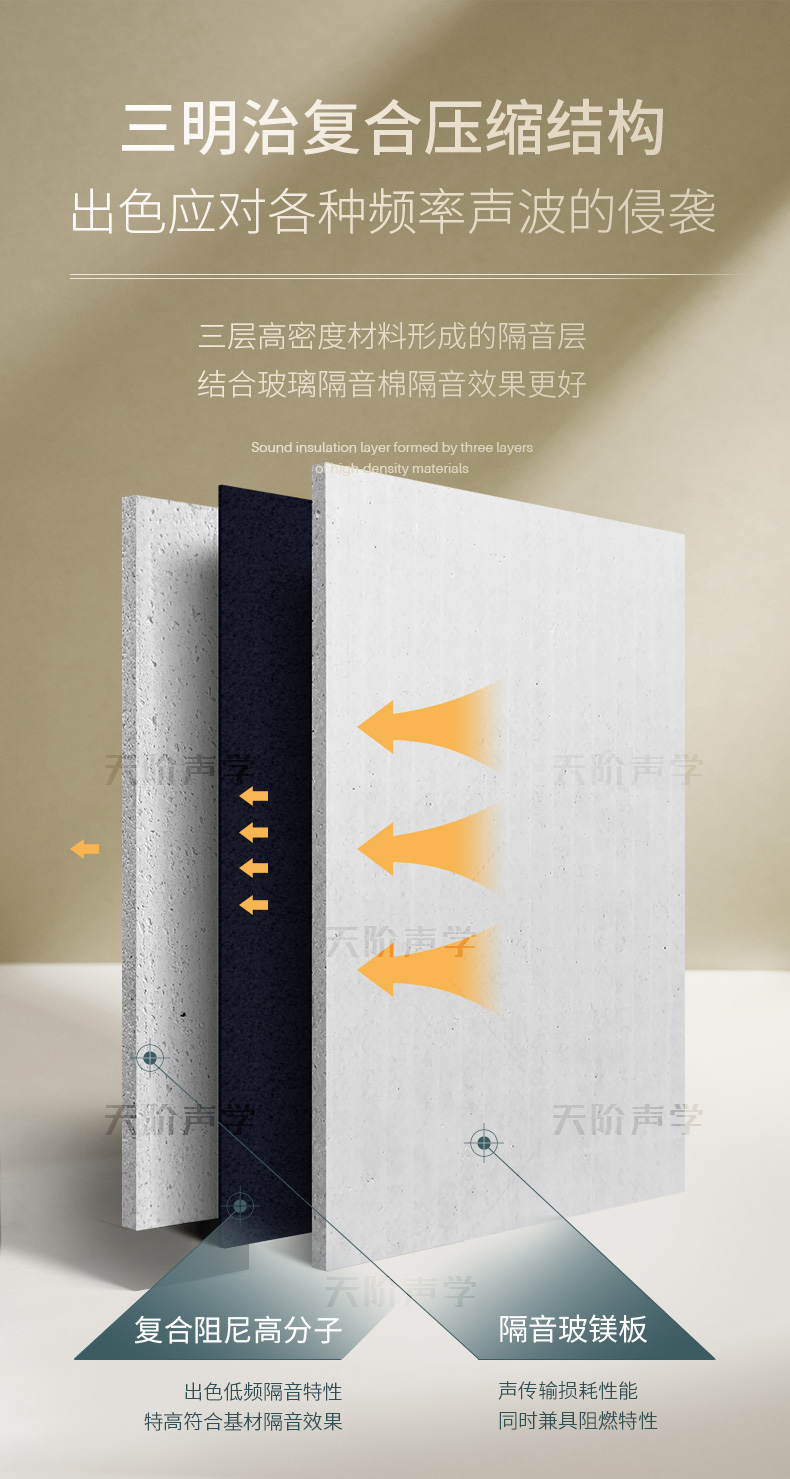 阻尼隔音板采用玻鎂基材,夾加高分子阻尼膠,三文治結(jié)構(gòu)高壓復(fù)合成型,形成阻尼復(fù)合結(jié)構(gòu),改變?cè)馁|(zhì)共振頻率,倍數(shù)提升原有材質(zhì)空氣隔聲量和結(jié)構(gòu)隔聲量。