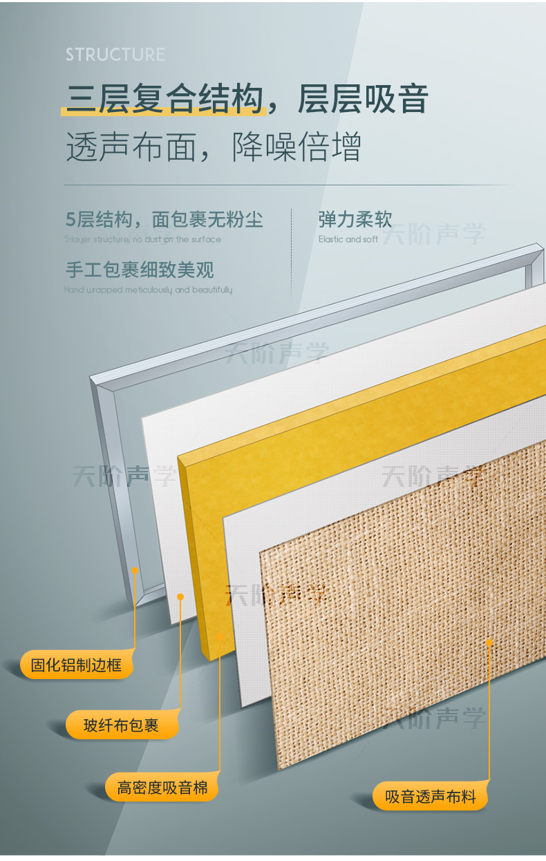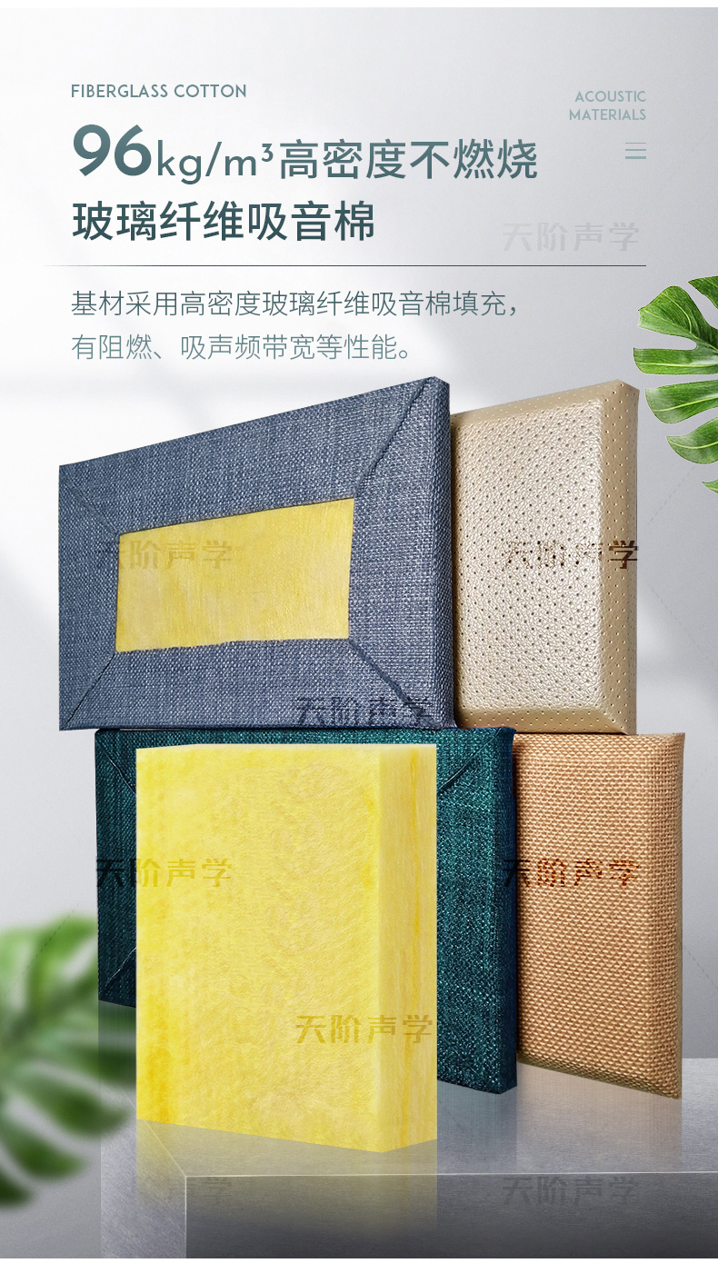 基材:96kg/m3 高密度玻璃纖維棉,聚酯板,中纖板(9cm素板)